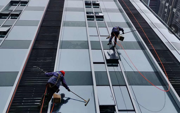 工人正在從上到下清洗洗刷玻璃外墻